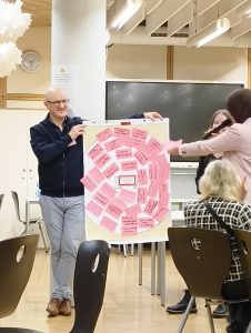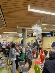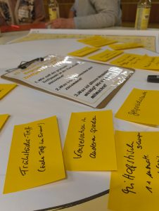 Anschließend geht es in die Arbeitsphase: An fünf Thementischen können sich die Bürger*innen zu einem Begegnungstreff, kulturellen Angeboten im Quartier, der Gestaltung von Freiräumen, Angebote für Familien mit kleinen und großen Kindern und der Stärkung von Nachbarschaften austauschen. Ein fünfter Thementisch steht für weitere Themen bereit, die zu keinem der anderen vier Angebote passen. In zwei Runden kommen die Menschen ins Gespräch. Auf bunten Zetteln werden die Ideen und Anregungen festgehalten und in einer Abschlussrunde im Plenum präsentiert. In den nächsten Monaten wird in Quartierswerkstätten mit den Ideen und Anregungen weitergearbeitet.